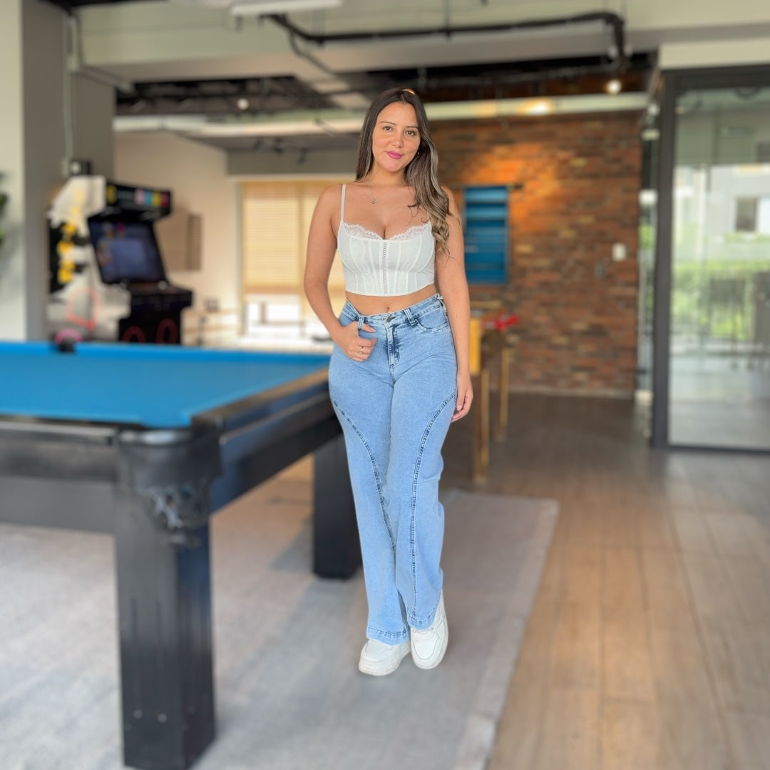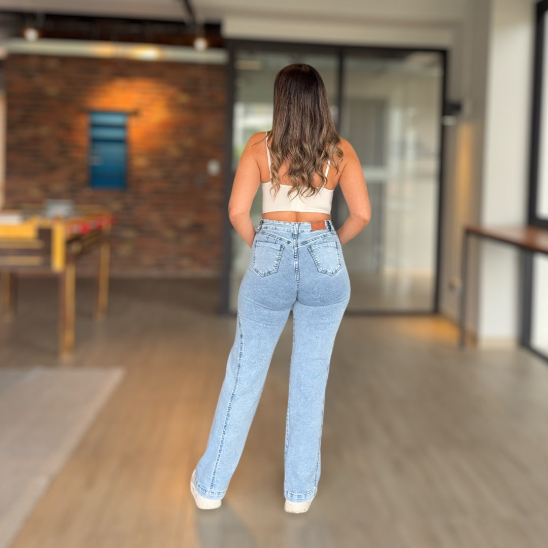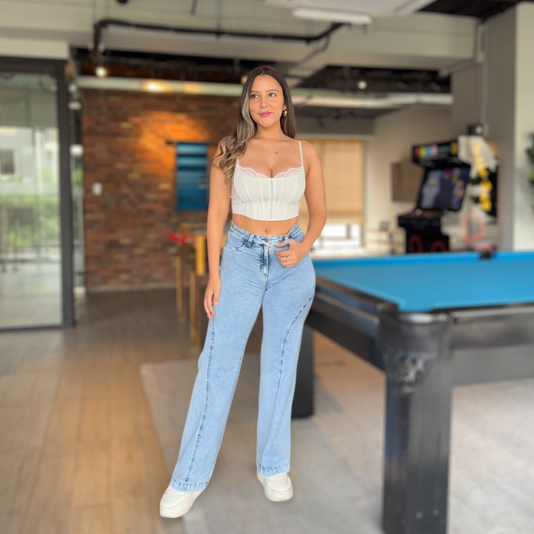 Cintura definida, cadera cómoda y pierna amplia con caída limpia.