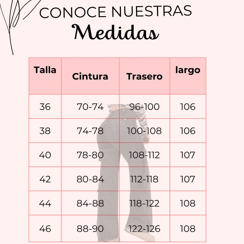 - Modelos usa talla 38 (sus medidas son contorno cintura: 76 cm y trasero 106 cm)