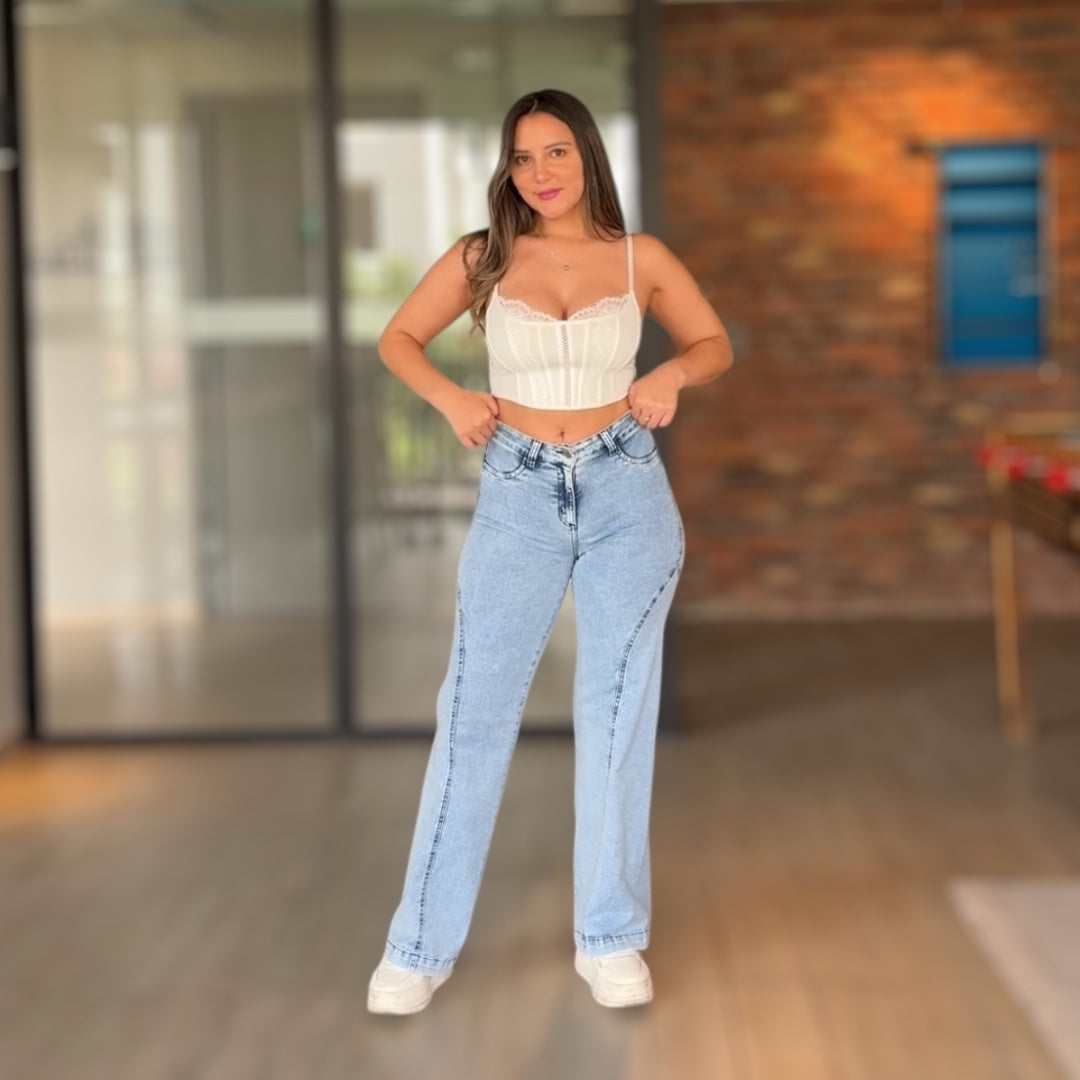 Jeans wide leg de marca propia Doble V, diseñado con foco en el calce y la comodidad.